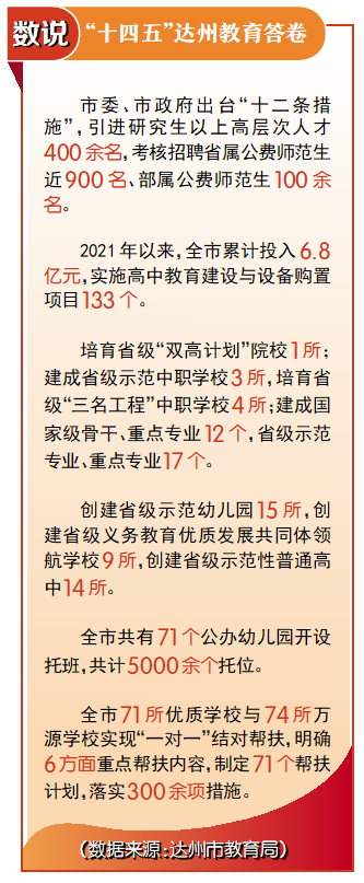 当前,群众对教育的需求已从“学有所教”转向了“学有优教”,教育托底性帮扶万源市,正是达州市推动教育优质均衡的有力举措。“‘十四五’以来,达州市以‘办好人民满意的教育’为核心目标,通过实施组建教育联盟、‘网链共享计划’、加大硬件投入等一系列有力举措,推动基础教育从‘有学上’向‘上好学’跨越式发展,让城乡学子共享优质教育阳光。”达州市教育局局长邓剑表示,下一步,达州市将加快编制教育事业发展“十五五”规划,建设教育强市,实现人口和资源更好匹配、供给和需求更加契合,努力打造“品正质优、普惠利民、开放包容、贯通融合”的达州教育品牌。