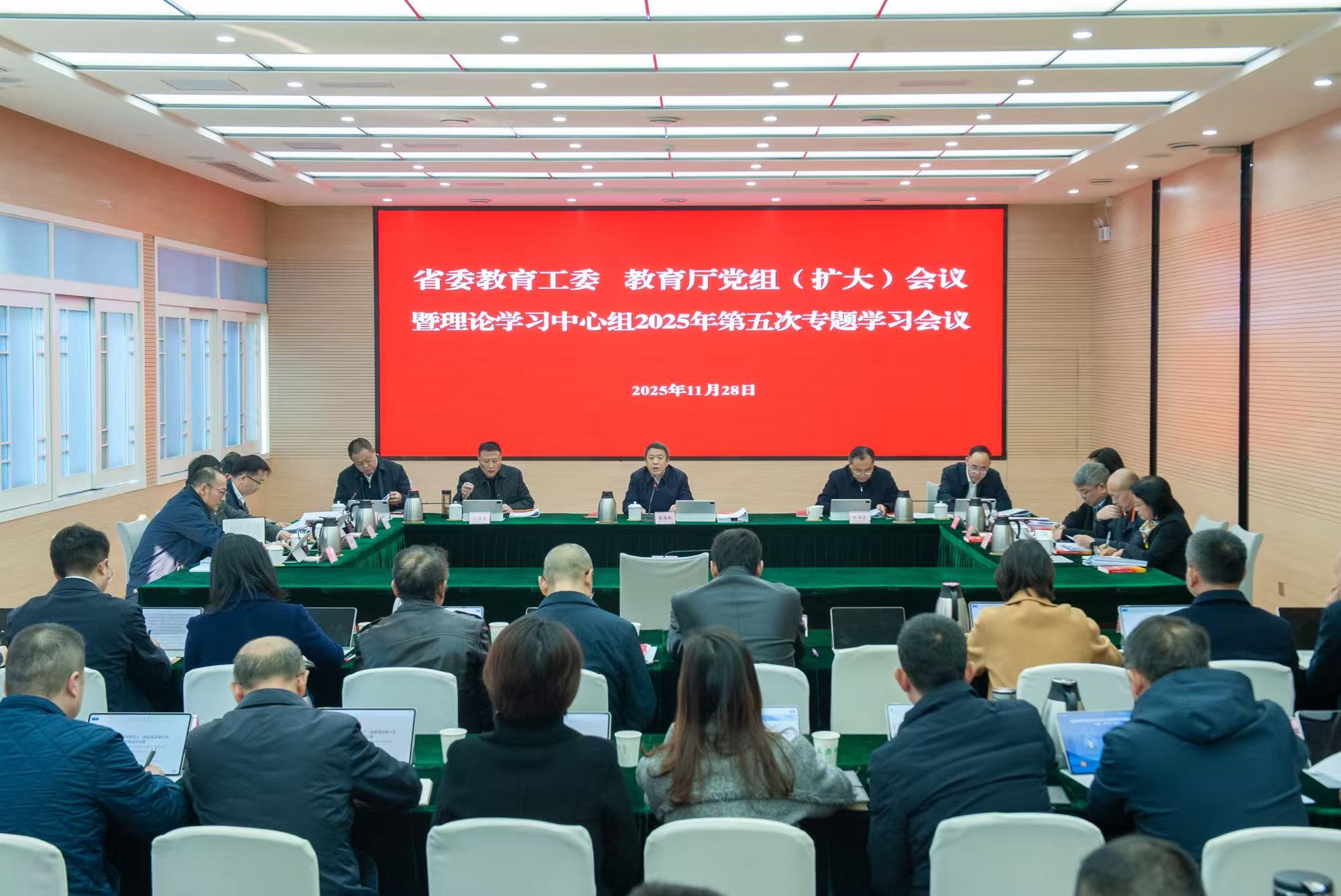 《教育导报》讯(记者 葛仁鑫 王浚录 摄影报道)11月28日,省委教育工委、教育厅党组召开(扩大)会议暨理论学习中心组2025年第五次专题学习会,传达学习省委十二届八次全会精神,研究教育系统贯彻落实意见。省委教育工委书记,教育厅党组书记、厅长陈冠松主持会议并讲话。
