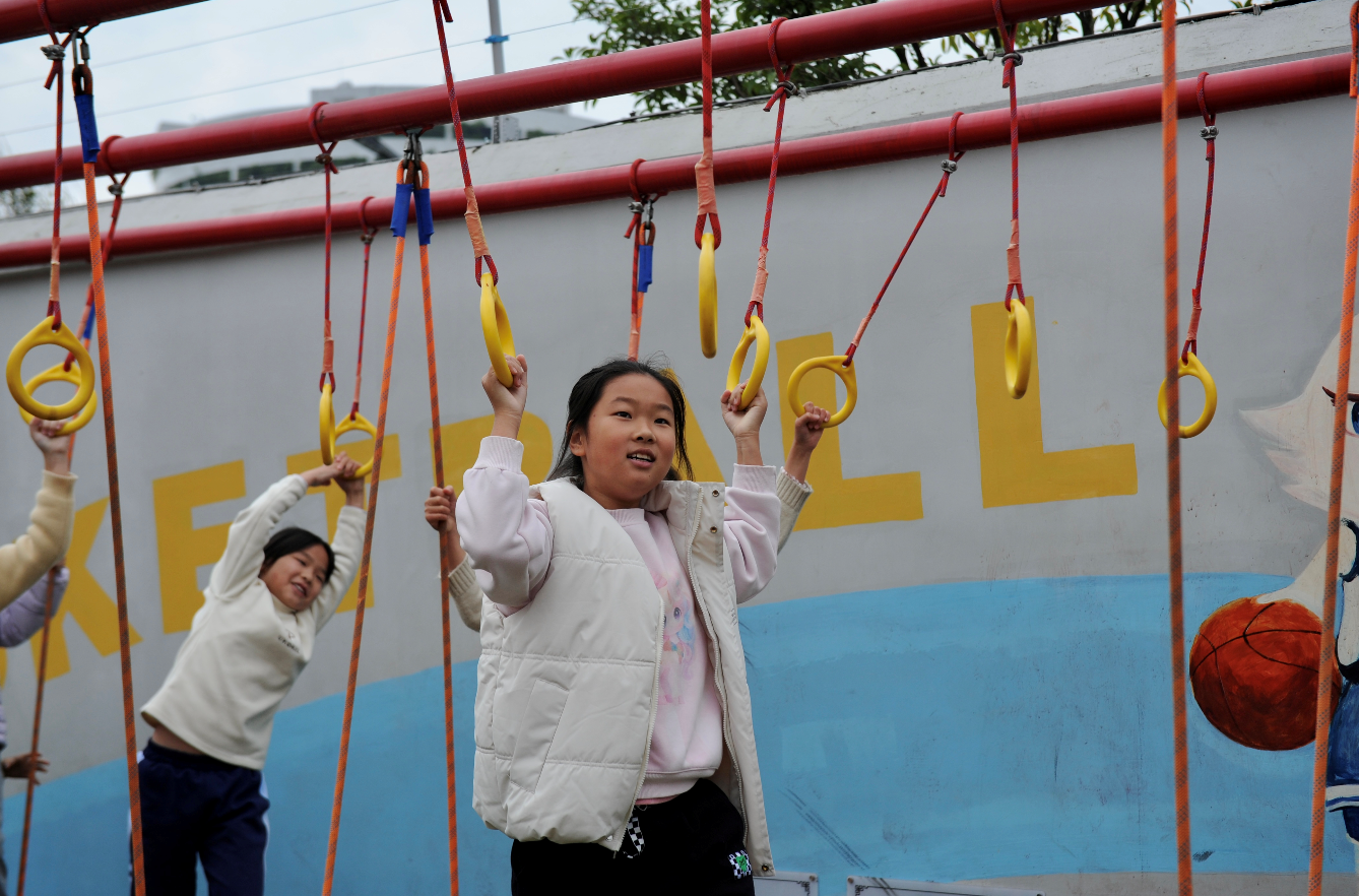 下课铃一响,宜宾市翠屏区旧州小学四年级5班学生屠棠宣放下课本,直奔操场的趣味器械区。她脚蹬独木桥、手抓吊环,保持身体平衡并安全通过,不少同学在一旁为她加油。