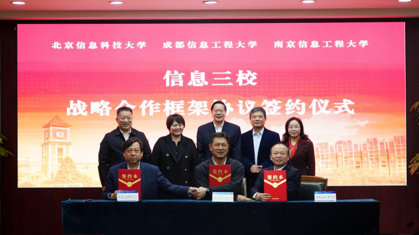 《教育导报》讯(苏畔)1月19日,北京信息科技大学、成都信息工程大学、南京信息工程大学在成都信息工程大学航空港校区举行“信息三校”战略合作框架协议签署仪式。此举标志着地处京津冀、长三角、成渝三大经济圈的三所特色鲜明的高等学府,打破地域界限,以“集团军”姿态共赴国家创新发展的战略高地。