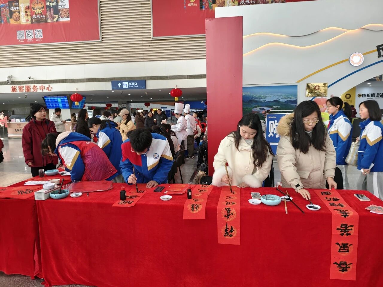 “梅传春信寒冬去,竹报平安好日来”……一幅幅吉祥喜庆的春联接连落笔。七年级12班席同学在现场分享道:“亲手写下的福字能温暖归乡人的旅途,我们还帮旅客解决了购票、指路等小问题,真切体会到‘帮助别人就是快乐自己’的意义!”一张张火红的福字、一副副喜庆的春联,汇聚成候车大厅里最亮眼的年味风景。