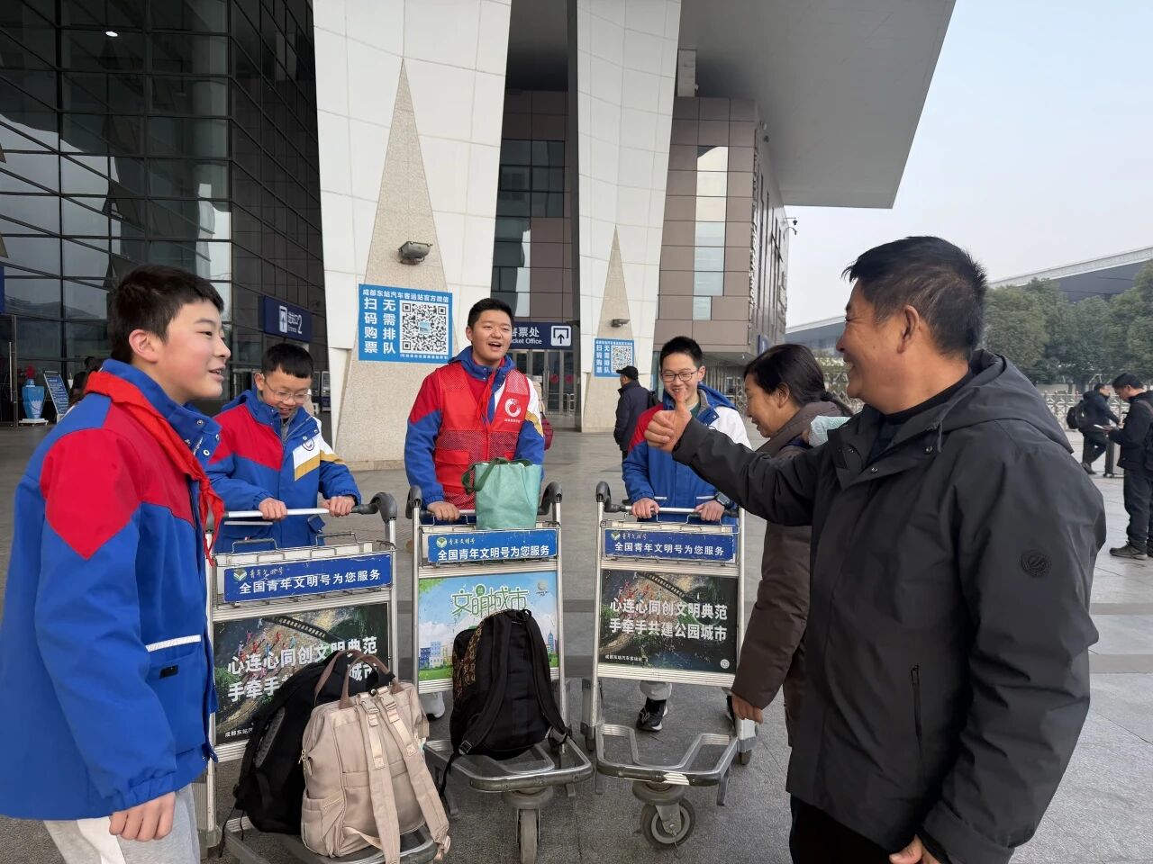 除传统笔墨书写外,师生和家长志愿者们还精心准备了中国结、“福”字剪纸等手工作品,将浓浓年味与美好祝福一并送出。学生们还前往车站周边开展暖心志愿服务:有的主动上前搭把手,推着搬运车协助旅客运送大件行李,让旅客的归乡路更顺畅;有的耐心指路,细致解答咨询;有的还手把手协助旅客操作自助购票设备,助力大家顺利购票。