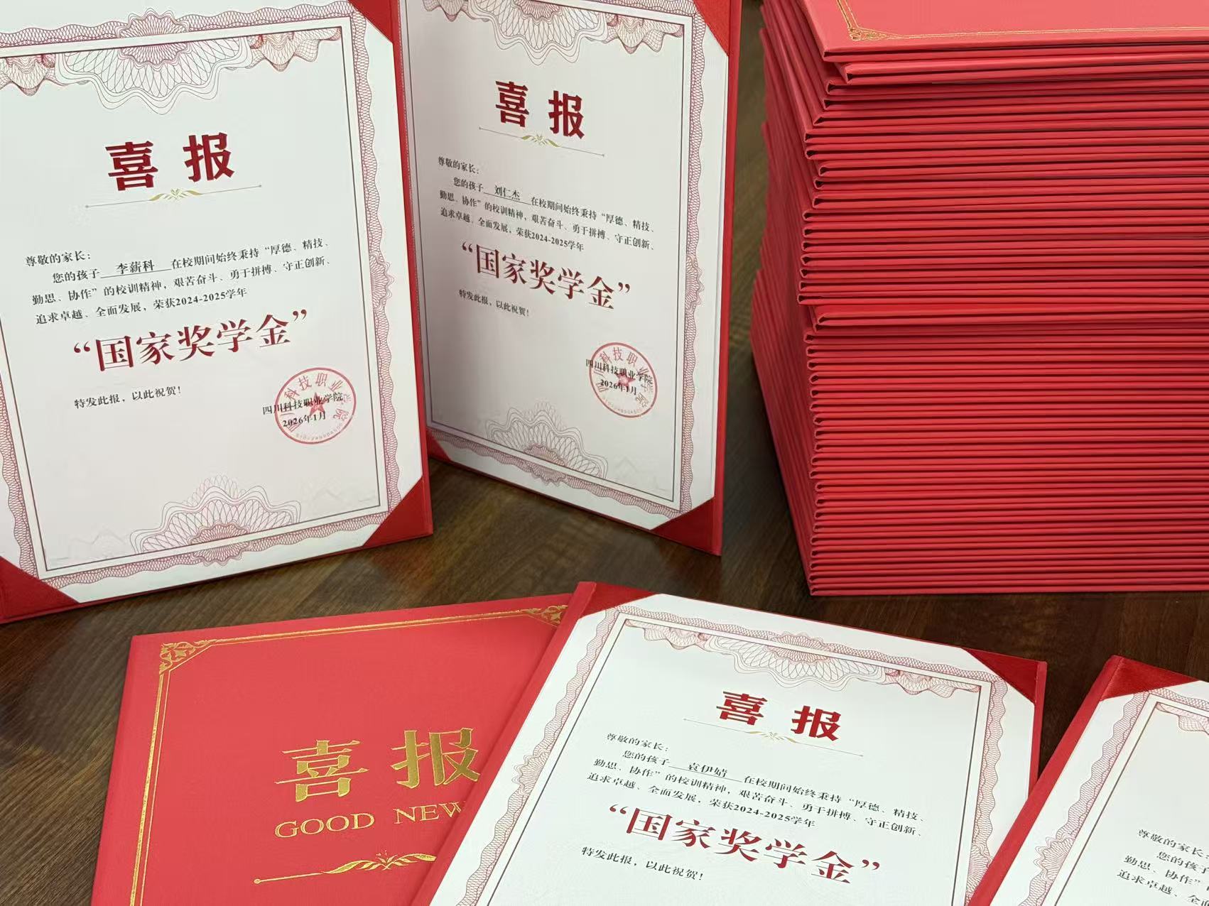 《教育导报》讯(邹凯 罗华丽)春节前夕,一份份被学子们称为“最有含金量的快递”,从四川科技职业学院飞向全国。这46份特殊的邮件里,装的是2024—2025学年国家奖学金的定制喜报,它们跨越山河,精准送达获奖学子家中,成为一份意义非凡的“新年礼物”。