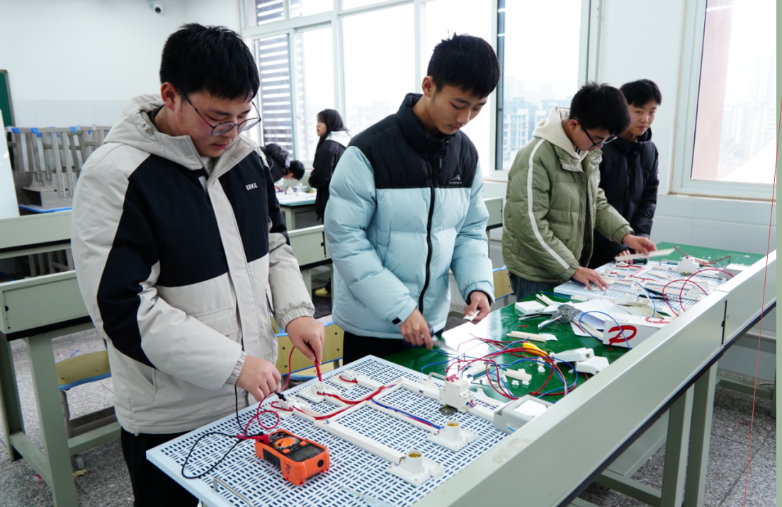 智能制造系聚焦电工基础技能,开展安全教育与实操训练。学生通过学习一灯两开、一灯一开一插等典型电路安装,掌握家庭常见照明电路的布线、连接与维修技能,并通过灯具安装考核,确保学生具备独立规范完成实操任务的能力。