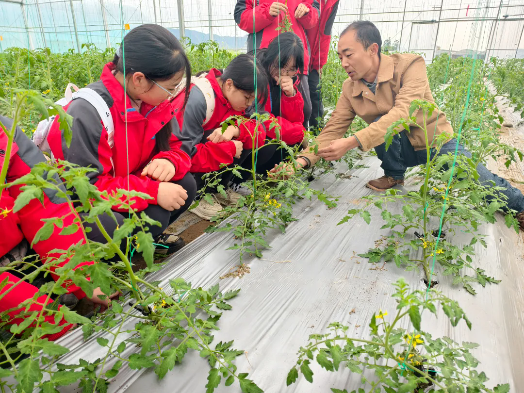 活动以一堂生动的“户外生物课”拉开序幕。在番茄种植大棚内,学生们实地了解番茄的主枝、侧芽、花果分布规律以及不同品种番茄的生长特性与管理要点,并认真学习了“抹芽”这一春耕技能。