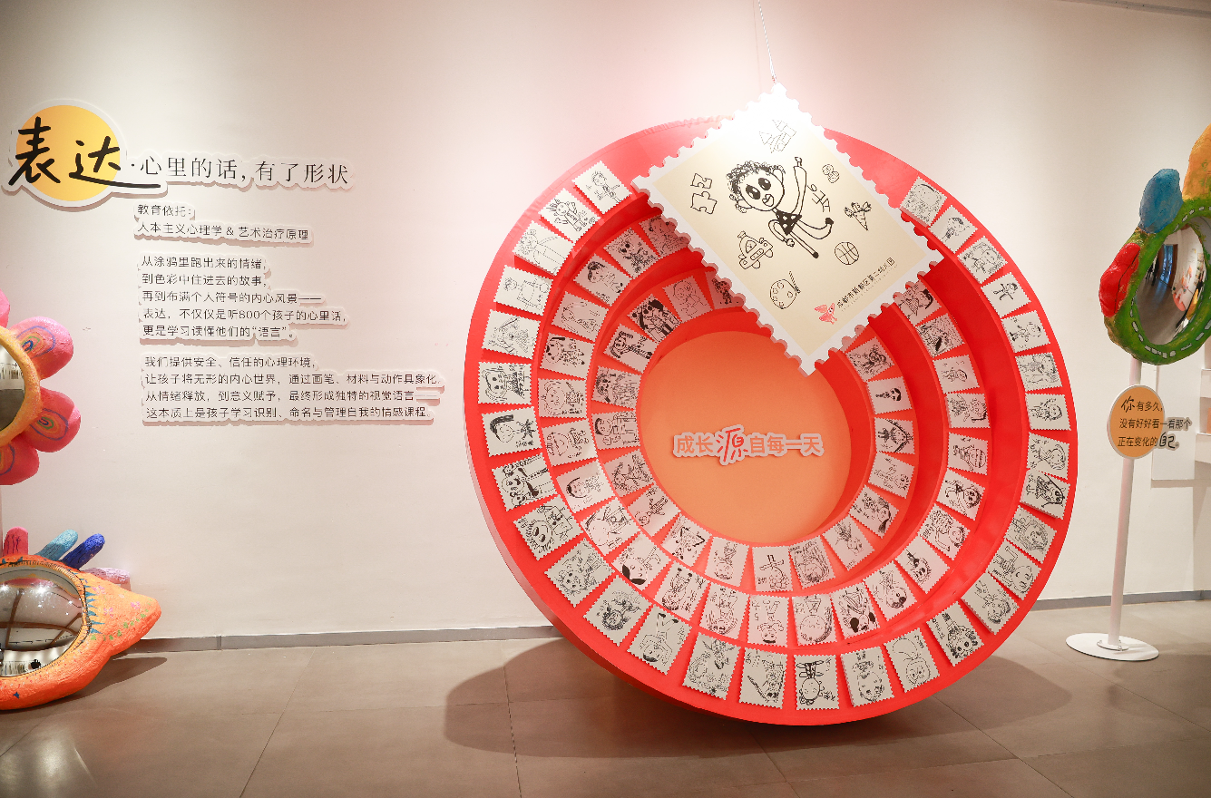 在“每个孩子都是自己的源头”主题展览中,对于拼音“yuan”的想象,呈现在孩子们丰富的“遣词造句”里——教师引导孩子们说出“幼儿园里的故事”、制作“圆圆的”手工、写下“圆满的话”……让参观者从美育的视角,理解孩子们在日常活动中发现的美、创造的美、表现的美的瞬间。