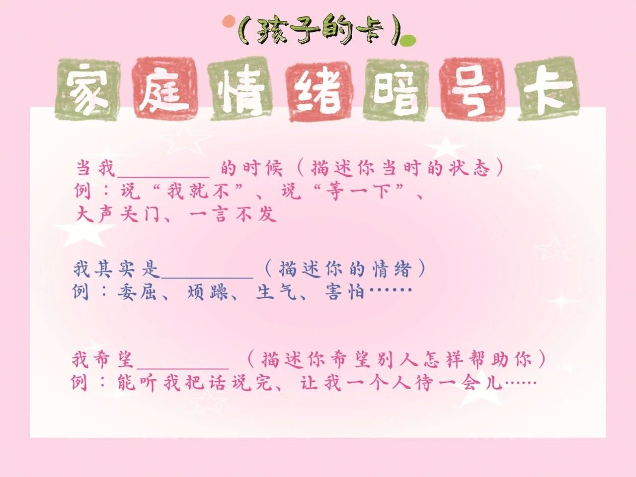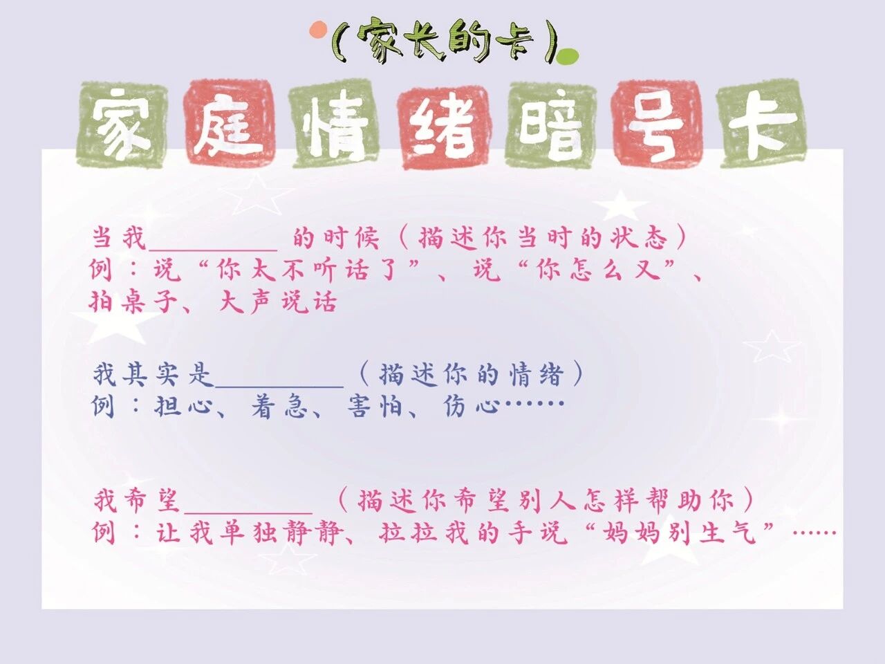 活动的最后,“彼此看见”的感动并没有停留在现场,而是落到了一张“家庭情绪暗号卡”上。这张卡片分为正反面,由孩子和家长分别填写同一个句式:“当我 ___的时候(行为),我其实 ___(真实情绪信号),我希望 ____(核心需求)。”