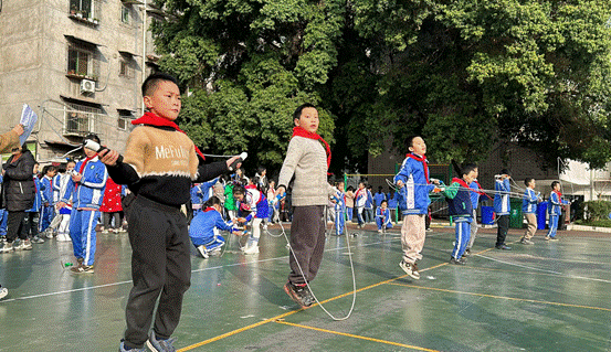 阳光课间,共筑健康活力校园。大课间活动时长30分钟:由体育教师组织,各班在语、数教师带领下师生共同参与依次完成各项锻炼内容。普通课间时长为15分钟,鼓励学生走出教室,积极开展适宜的体育运动,如原地跳绳、踢毽子、跳远、打沙包、跳房子等。丰富的课间体育活动帮助同学们舒展身体、愉悦心情,培养运动兴趣、增强体质。